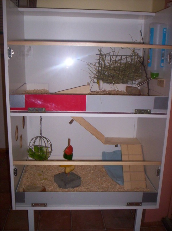 - tak takhle bydlí naše morčata, když jsme si je donesli obývala klec koupenou ve zverimexu, která však nebyla dostatečně velká, teď mají tohle "panelákové" bydlení a jsou spokojené.